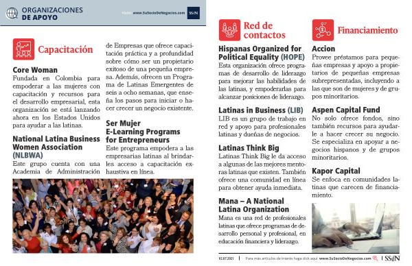Este grupo cuenta con una Academia de Administración de Empresas que ofrece capacitación práctica y a profundidad sobre cómo ser un propietario exitoso de una pequeña empresa . Además , ofrecen un Programa de Latinas Emergentes de seis a ocho semanas , que enseña los pasos para iniciar o hacer crecer un negocio existente .