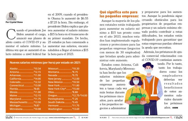 Aunque la mayoría de los planes estatales están trabajando para aumentar su salario mínimo a $ 15 tan pronto como en el año 2023 , muchos estados han implementado regulaciones y protecciones para las pequeñas empresas ( negocios con menos de 30 empleados ) que brindan ayuda para administrar este aumento . Estados como Arizona , California , Maryland y Minnesota han hecho que los salarios mínimos de las pequeñas empresas aumenten a tasas cada vez más lentas durante los próximos cinco años , para ayudar a los pequeños negocios a administrar y prepararse para los aumentos . Aunque la pandemia sigue creando obstáculos para los propietarios de pequeñas empresas y un salario mínimo elevado podría contribuir a estas dificultades , los estados están trabajando para garantizar que estas empresas puedan obtener la ayuda que necesitan . Además , los préstamos de ayuda comercial relacionados con el COVID-19 continúan aumentando . Por lo tanto , tanto los trabajadores como los empleadores deberían ver resultados beneficiosos de estos aumentos salariales durante los próximos años . SSDN