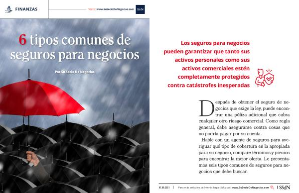 Después de obtener el seguro de negocios que exige la ley , puede encontrar una póliza adicional que cubra cualquier otro riesgo comercial . Como regla general , debe asegurarse contra cosas que no podría pagar por su cuenta . Hable con un agente de seguros para averiguar qué tipo de cobertura es la apropiada para su negocio , compare términos y precios para encontrar la mejor oferta . Le presentamos seis tipos comunes de seguros para negocios que debe buscar .