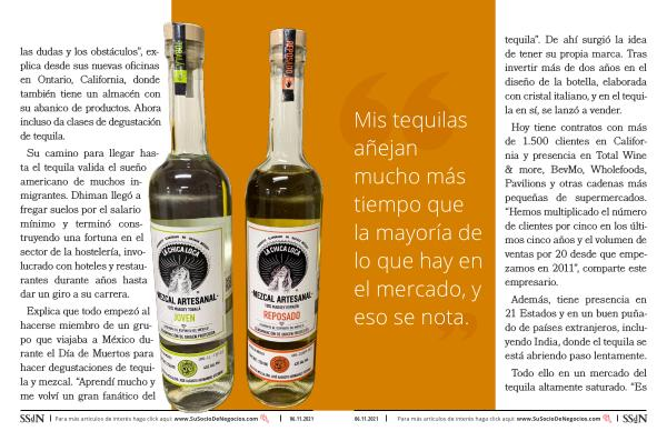 Mis tequilas añejan mucho más tiempo que la mayoría de lo que hay en el mercado , y eso se nota . tequila ”. De ahí surgió la idea de tener su propia marca . Tras invertir más de dos años en el diseño de la botella , elaborada con cristal italiano , y en el tequila en sí , se lanzó a vender . Hoy tiene contratos con más de 1.500 clientes en California y presencia en Total Wine & more , BevMo , Wholefoods , Pavilions y otras cadenas más pequeñas de supermercados . “ Hemos multiplicado el número de clientes por cinco en los últimos cinco años y el volumen de ventas por 20 desde que empezamos en 2011 ”, comparte este empresario . Además , tiene presencia en 21 Estados y en un buen puñado de países extranjeros , incluyendo India , donde el tequila se está abriendo paso lentamente . Todo ello en un mercado del tequila altamente saturado . “ Es