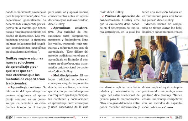 tener una medición basada en el rendimiento para unir todas las piezas ”, dice Guilkey . “ Muchos líderes de compañías no tienen claras las habilidades y conocimientos reales estudiantes aplican sus habilidades y conocimientos , en lugar del estilo tradicional de prueba para la memorización . “ Hay una gran diferencia entre poder recordar información y de sus empleados y sí están proporcionando una ventaja competitiva ”, dice Guilkey . “ Nunca creará una ventaja competitiva con los métodos de capacitación tradicionales ”. SSDN