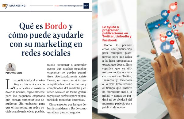 La publicidad y el marketing en las redes sociales se están convirtiendo en lo normal , especialmente para las pequeñas empresas que buscan aumentar sus seguidores . Sin embargo , para que el marketing en redes sociales sea lo más eficaz posible , puede comenzar a acumular gastos que muchas pequeñas empresas no pueden permitirse . Afortunadamente existe Bordo , un nuevo servicio que simplifica las partes costosas y complicadas del marketing en redes sociales de forma gratuita y que es perfecto para propietarios de pequeñas empresas . Cinco razones por las que debería considerar a Bordo como un aliado para su negocio :