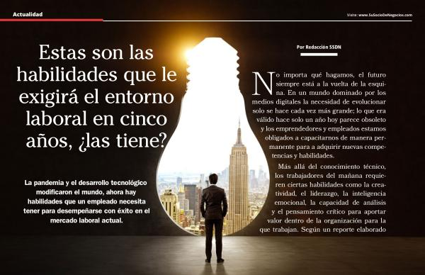 No importa qué hagamos , el futuro siempre está a la vuelta de la esquina . En un mundo dominado por los medios digitales la necesidad de evolucionar solo se hace cada vez más grande ; lo que era válido hace solo un año hoy parece obsoleto y los emprendedores y empleados estamos obligados a capacitarnos de manera permanente para a adquirir nuevas competencias y habilidades . Más allá del conocimiento técnico , los trabajadores del mañana requieren ciertas habilidades como la creatividad , el liderazgo , la inteligencia emocional , la capacidad de análisis y el pensamiento crítico para aportar valor dentro de la organización para la que trabajan . Según un reporte elaborado