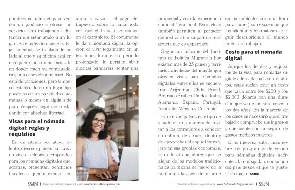 Aunque los detalles y requisitos de la visa para nómadas digitales de cada país son distintos , estas suelen tener un costo que varía entre los $ 200 y los $ 2,000 dólares con una duración que va de los seis meses a los dos años . En la mayoría de los casos es necesario que el trabajador compruebe sus ingresos y que cuente con un seguro de gastos médicos mayores . Si te interesa saber más sobre los programas de visado para nómadas digitales , acércate a la embajada o consulado del país desde el que te gustaría trabajar . SSDN