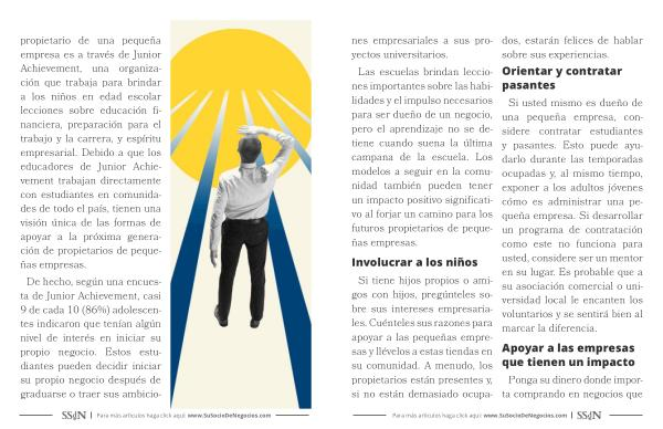 propietario de una pequeña empresa es a través de Junior Achievement , una organización que trabaja para brindar a los niños en edad escolar lecciones sobre educación financiera , preparación para el trabajo y la carrera , y espíritu empresarial . Debido a que los educadores de Junior Achievement trabajan directamente con estudiantes en comunidades de todo el país , tienen una visión única de las formas de apoyar a la próxima generación de propietarios de pequeñas empresas . De hecho , según una encuesta de Junior Achievement , casi 9 de cada 10 ( 86 %) adolescentes indicaron que tenían algún nivel de interés en iniciar su propio negocio . Estos estudiantes pueden decidir iniciar su propio negocio después de graduarse o traer sus ambicio-