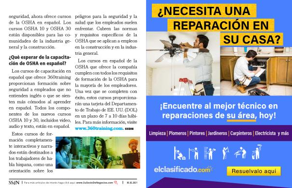 peligros para la seguridad y la salud que los empleados suelen enfrentar . Cubren las normas y requisitos específicos de la OSHA que se aplican a empleos en la construcción y en la industria general . Los cursos en español de la OSHA que ofrece la compañía cumplen con todos los requisitos de formación de la OSHA para la mayoría de los empleadores . Una vez que se completen con éxito , estos cursos proporcionarán una tarjeta del Departamento de Trabajo de EE . UU . ( DOL ) en un plazo de 7 a 10 días hábiles . Para más información , visite www . 360training . com . SSDN