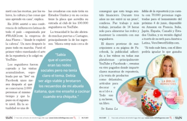 metí con las recetas , por los valores , la cultura y las cosas que uno aprende en casa ”, explica . En 2016 asistió a una conferencia de influencers latinas de todo el país — organizada por # WeAllGrow , la empresa de Ana Flores — “ donde le explotó la cabeza ”. Un mes después lo puso todo en marcha . Parió el primer video enseñando el arte de la repostería y lo colgó en YouTube . Los seguidores fueron cayendo y las visitas acumulándose , espoleada por un “ live ” en Facebook unos meses después al que se conectaron 2.000 personas al mismo tiempo y que la puso en el siguiente nivel . En la actualidad es una de las creadoras con más tirón en Estados Unidos y en su cocina tiene la placa que acredita su entrada al club de los 100.000 seguidores en YouTube . La tenacidad le ha ido abriendo muchas puertas a Castagno , principalmente la de los ingresos . “ Ahora estoy más cerca de