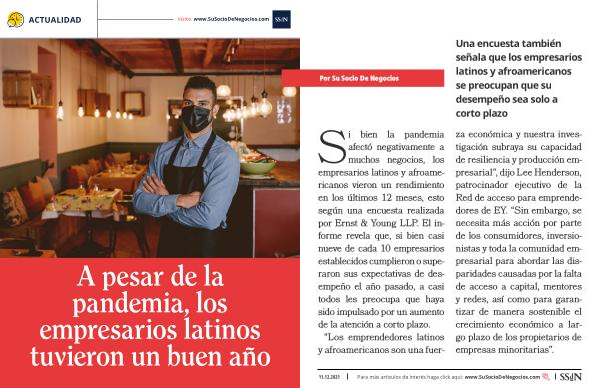 Si bien la pandemia afectó negativamente a muchos negocios , los empresarios latinos y afroamericanos vieron un rendimiento en los últimos 12 meses , esto según una encuesta realizada por Ernst & Young LLP . El informe revela que , si bien casi nueve de cada 10 empresarios establecidos cumplieron o superaron sus expectativas de desempeño el año pasado , a casi todos les preocupa que haya sido impulsado por un aumento de la atención a corto plazo . “ Los emprendedores latinos y afroamericanos son una fuerza económica y nuestra investigación subraya su capacidad de resiliencia y producción empresarial ”, dijo Lee Henderson , patrocinador ejecutivo de la Red de acceso para emprendedores de EY . “ Sin embargo , se necesita más acción por parte de los consumidores , inversionistas y toda la comunidad empresarial para abordar las disparidades causadas por la falta de acceso a capital , mentores y redes , así como para garantizar de manera sostenible el crecimiento económico a largo plazo de los propietarios de empresas minoritarias ”.