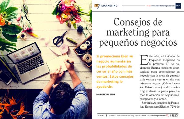Este año , el Sábado de Pequeños Negocios es el próximo 27 de noviembre . Es una excelente oportunidad para promocionar su negocio con la meta de generar más ventas y cerrar el año con números negros . ¿ Cómo hacerlo ? Estos consejos de marketing le darán la pauta para llamar la atención de seguidores , prospectos y clientes . Según la Asociación de Pequeñas Empresas ( SBA ), el 77 % de