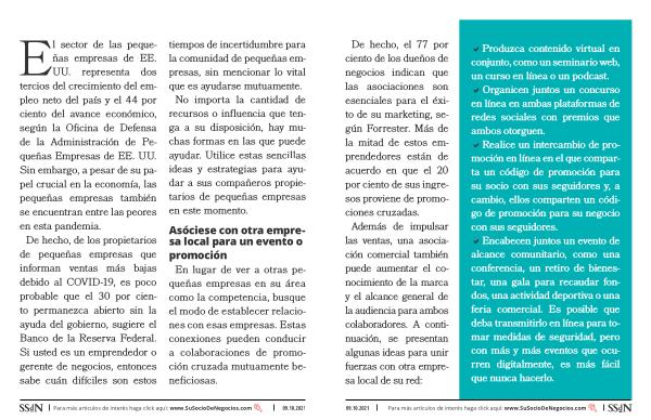 El sector de las pequeñas empresas de EE . UU . representa dos tercios del crecimiento del empleo neto del país y el 44 por ciento del avance económico , según la Oficina de Defensa de la Administración de Pequeñas Empresas de EE . UU . Sin embargo , a pesar de su papel crucial en la economía , las pequeñas empresas también se encuentran entre las peores en esta pandemia . De hecho , de los propietarios de pequeñas empresas que informan ventas más bajas debido al COVID-19 , es poco probable que el 30 por ciento permanezca abierto sin la ayuda del gobierno , sugiere el Banco de la Reserva Federal . Si usted es un emprendedor o gerente de negocios , entonces sabe cuán difíciles son estos tiempos de incertidumbre para la comunidad de pequeñas empresas , sin mencionar lo vital que es ayudarse mutuamente . No importa la cantidad de recursos o influencia que tenga a su disposición , hay muchas formas en las que puede ayudar . Utilice estas sencillas ideas y estrategias para ayudar a sus compañeros propietarios de pequeñas empresas en este momento .