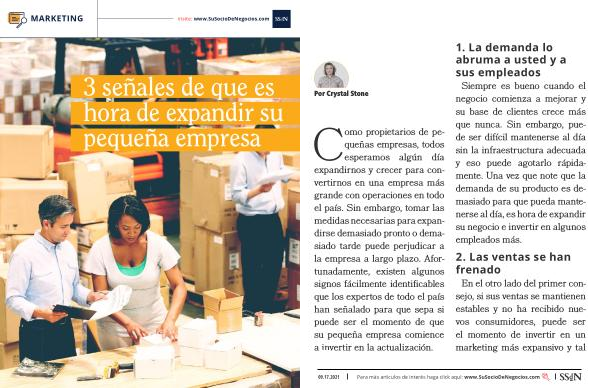 Como propietarios de pequeñas empresas , todos esperamos algún día expandirnos y crecer para convertirnos en una empresa más grande con operaciones en todo el país . Sin embargo , tomar las medidas necesarias para expandirse demasiado pronto o demasiado tarde puede perjudicar a la empresa a largo plazo . Afortunadamente , existen algunos signos fácilmente identificables que los expertos de todo el país han señalado para que sepa si puede ser el momento de que su pequeña empresa comience a invertir en la actualización .