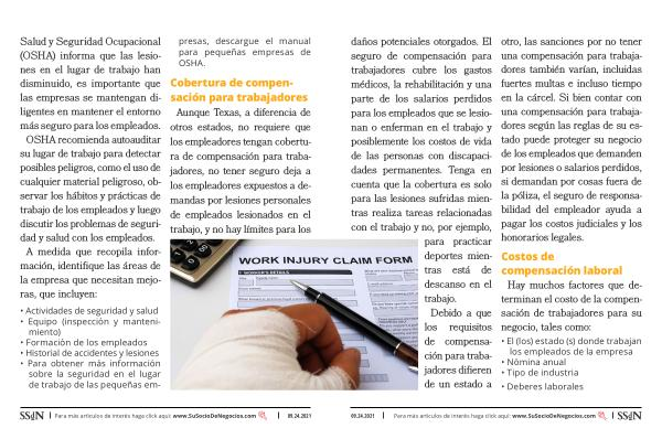 Cobertura de compensación para trabajadores Aunque Texas , a diferencia de otros estados , no requiere que los empleadores tengan cobertura de compensación para trabajadores , no tener seguro deja a los empleadores expuestos a demandas por lesiones personales de empleados lesionados en el trabajo , y no hay límites para los
