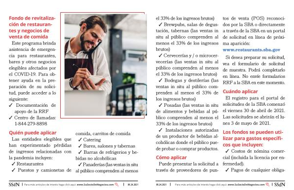 Fondo de revitalización de restaurantes y negocios de venta de comida Este programa brinda asistencia de emergencia para restaurantes , bares y otros negocios elegibles afectados por el COVID-19 . Para obtener ayuda en la preparación de su solicitud , puede acceder a lo siguiente :