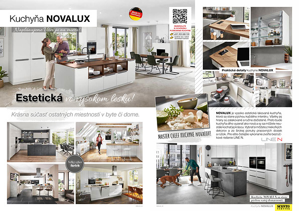 NOVALUX je vysoko estetická lakovaná kuchyňa , ktorá sa stane pýchou každého interiéru . Všetky jej hrany sú zalakované a ručne dočistené . Preto bude kuchyňa dlho vyzerať ako nová a vy sa môžete neustále kochať jej krásou . Vybrať si môžete z niekoľkých dekorov a zo širokej ponuky pracovných dosiek a rúčok . Pre ešte čistejšie vykonanie zvoľte bezrúčkové riešenie LINE N .