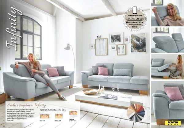 moderní modulový systém čalouněného nábytku z originální tkaniny , vysoký komfort sezení díky jádru z vlnitých pružin a studené pěny , různé relaxační funkce , úložné prostory , možnost individuálního plánování dle typového plánu