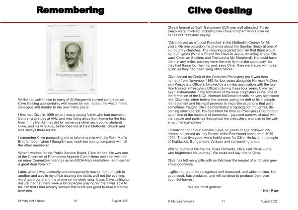 Clive served as Chair of the Canberra Presbytery ( as it was then named ) from November 1983 for four years alongside Norman McDonald ( Presbytery Officer ), followed by a similar association with the late Ron Reeson ( Presbytery Officer ). During these four years , Clive had been instrumental in the formation of the local presbytery in the time of the formation of the UCA . Norman McDonald recalls the very significant role Clive had , often behind the scenes , using his deft skills in people management and his legal prowess to negotiate situations that were sometimes fraught . Clive demonstrated a capacity for thoughtful , discerning conversation . He described his time as Presbytery Chairperson as a “ time of the happiest of memories – joys and sorrows shared with the people and parishes throughout the presbytery , and also in the wider ecumenical sphere .”