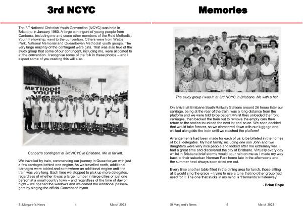 The 3 rd National Christian Youth Convention ( NCYC ) was held in Brisbane in January 1960 . A large contingent of young people from Canberra , including me and some other members of the Reid Methodist Youth Fellowship , went to the convention . Others were from Wattle Park , National Memorial and Queanbeyan Methodist youth groups . The very large majority of the contingent were girls . That was also true of the study group that some of our contingent , including me , were allocated to at the convention . I recognise some of the folk in these photos – and I expect some of you reading this will also .