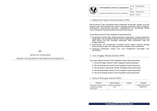 Manual Standar Proses Pengabdian kepada Masyarakat dimaksudkan sebagai acuan dan pedoman bagi sivitas akademika dan seluruh pemangku kepentingan dalam menetapkan, melaksanakan, mengevaluasi pelaksanaan, mengendalikan, dan meningkatkan Standar Proses Pengabdian Kepada MasyarakatUniversitas Pelita Harapan.