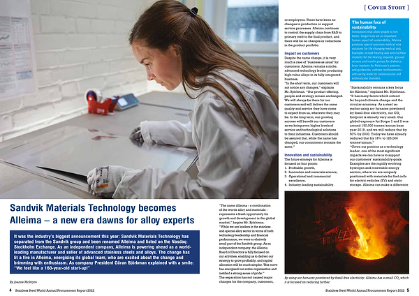 It was the industry ’ s biggest announcement this year : Sandvik Materials Technology has separated from the Sandvik group and been renamed Alleima and listed on the Nasdaq Stockholm Exchange . As an independent company , Alleima is powering ahead as a worldleading manufacturer and seller of advanced stainless steels and alloys . The change has lit a fire in Alleima , energising its global team , who are excited about the change and brimming with enthusiasm . As company President Göran Björkman explained with a smile : “ We feel like a 160-year-old start-up !”