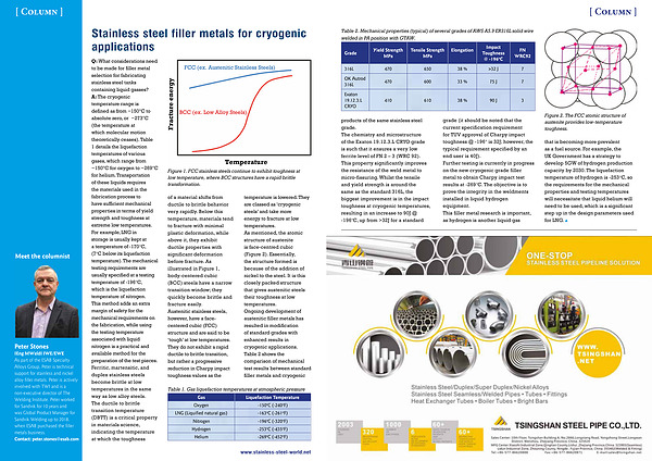 products of the same stainless steel grade . The chemistry and microstructure of the Exaton 19.12.3 . L CRYO grade is such that it ensures a very low ferrite level of FN 2 – 3 ( WRC 92 ). This property significantly improves the resistance of the weld metal to micro-fissuring . Whilst the tensile and yield strength is around the same as the standard 316L , the biggest improvement is in the impact toughness at cryogenic temperatures , resulting in an increase to 90J @ -196 ° C , up from > 32J for a standard grade ( it should be noted that the current specification requirement for TUV approval of Charpy impact toughness @ -196 ° is 32J ; however , the typical requirement specified by an end user is 40J ). Further testing is currently in progress on the new cryogenic grade filler metal to obtain Charpy impact test results at -269 ° C . The objective is to prove the integrity in the weldments installed in liquid hydrogen equipment . This filler metal research is important , as hydrogen is another liquid gas