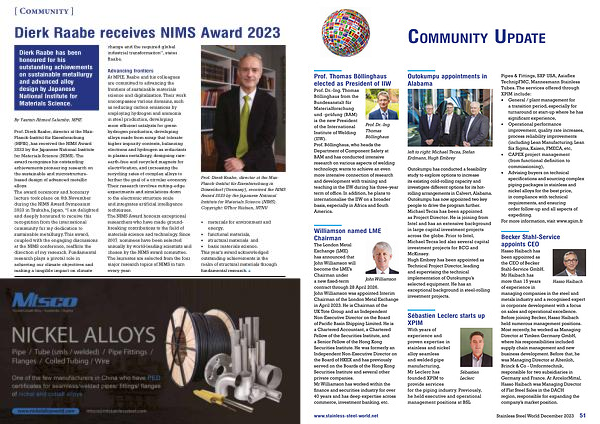 Prof . Dierk Raabe , director at the Max- Planck-Institut für Eisenforschung ( MPIE ), has received the NIMS Award 2023 by the Japanese National Institute for Materials Science ( NIMS ). The award recognizes his outstanding achievements pioneering research on the sustainable and microstructurebased design of advanced metallic alloys . The award ceremony and honorary lecture took place on 6th November during the NIMS Award Symposium 2023 in Tsukuba , Japan . “ I am delighted and deeply honoured to receive this recognition from the international community for my dedication to sustainable metallurgy . This award , coupled with the engaging discussions at the NIMS conference , reaffirm the direction of my research . Fundamental research plays a pivotal role in achieving our climate objectives and making a tangible impact on climate change and the required global industrial transformation ”, states Raabe .