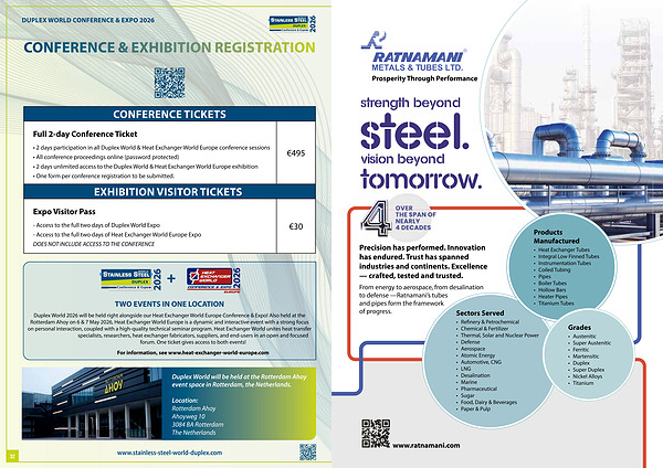 • 2 days participation in all Duplex World & Heat Exchanger World Europe conference sessions