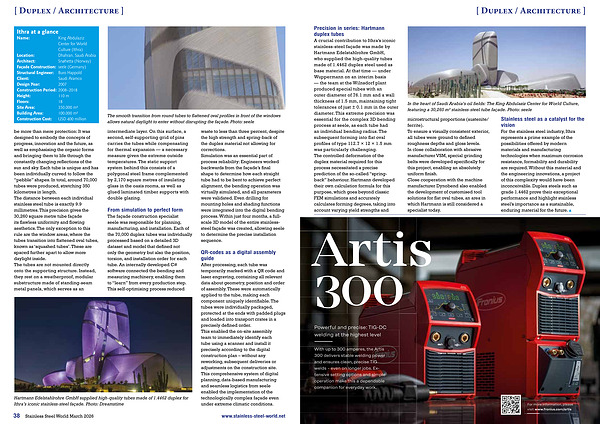Stainless steel as a catalyst for the vision For the stainless steel industry, Ithra represents a prime example of the possibilities offered by modern materials and manufacturing technologies when maximum corrosion resistance, formability and durability are required. Without this material and the engineering innovations, a project of this complexity would have been inconceivable. Duplex steels such as grade 1.4462 prove their exceptional performance and highlight stainless steel’ s importance as a sustainable, enduring material for the future.