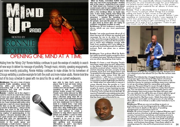Hailing from the "Windy City" Ronnie Holliday continues to push the evelope of creativity in search of new ways to deliver his message of positivity. Through music, ministry, speaking enagagments, and more recently podcasting, Ronnie Holliday continues to make strides for his hometown of Chicago exhibiting a positive example for both the youth and more mature adults. Ronnie took time out of his busy schedule to speak with me about his life as well as current endeavors.
