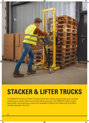 The STANLEY ® Commercial Pallet Truck gets the job done . All the essential features are included : overflow valve , tandem rollers , and a three position pump lever . The STANLEY ® yellow ensures high visibility . The metal frame is built to last . Available in different fork lengths with smart 80cm markings stamped in the forks .