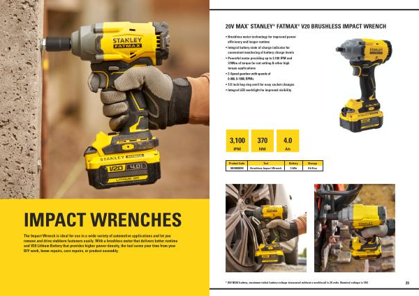The Impact Wrench is ideal for use in a wide variety of automotive applications and let you remove and drive stubborn fasteners easily . With a brushless motor that delivers better runtime and V20 Lithium Battery that provides higher power density , the tool saves your time from your DIY work , home repairs , cars repairs , or product assembly .