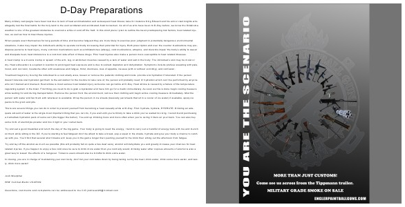 There are several things you can do in order to prevent yourself from becoming a heat casualty while at D-Day. First: hydrate, hydrate, HYDRATE. Drinking an adequate amount of water is the single most important thing that you can do, if you wait until you’ re thirsty to take a drink you’ ve waited too long. I recommend purchasing a Camelbak hydration pack of some sort( the bigger the better). You end up drinking more and more often when you’ re caring 3 liters on your back. You can also buy some form of electrolyte powder and mix it right in your camel back.