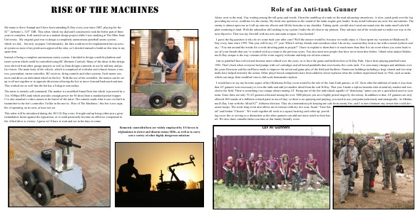 My name is Steve Stumpf and I have been attending D-Day every year since 2007, playing for the 82 nd Airborne’ s, 325 th GIR. This robot, which my dad and I constructed, took the better part of three years to complete. It all started out as a student design project while I was studying at The Ohio State University. My original goal was to design a completely autonomous paintball sentry system … which we did … but only on paper. Unfortunately, the idea could never be implemented into an actual system as none of my professors approved the idea; so I decided instead to build on this idea in my spare time.