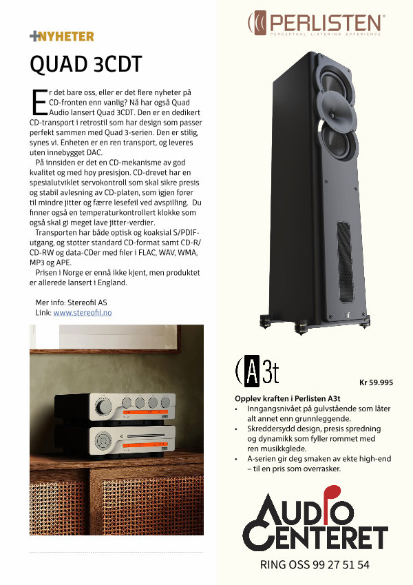 Er det bare oss, eller er det flere nyheter på CD-fronten enn vanlig? Nå har også Quad Audio lansert Quad 3CDT. Den er en dedikert CD-transport i retrostil som har design som passer perfekt sammen med Quad 3-serien. Den er stilig, synes vi. Enheten er en ren transport, og leveres uten innebygget DAC.