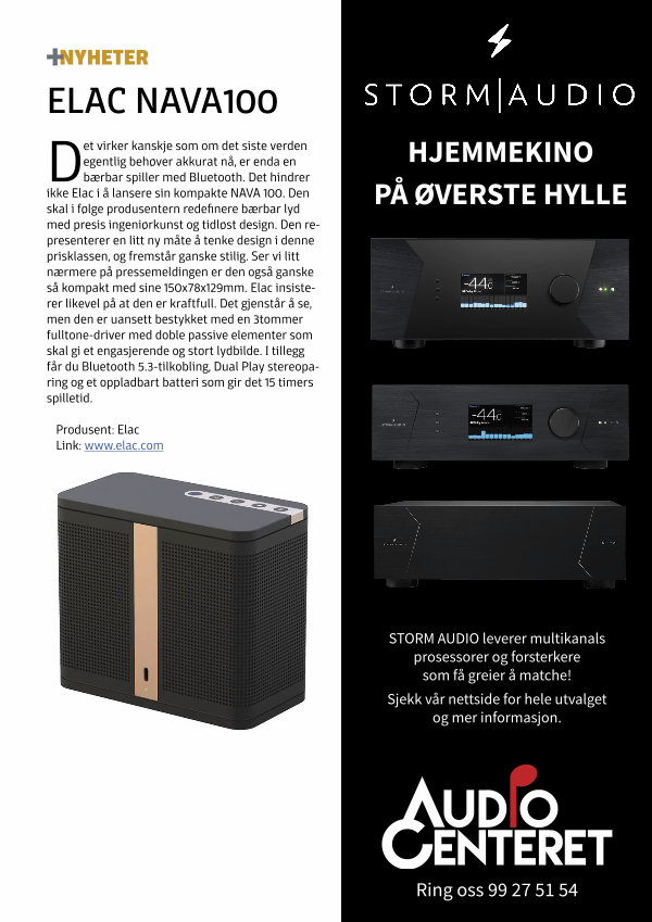 Det virker kanskje som om det siste verden egentlig behøver akkurat nå, er enda en bærbar spiller med Bluetooth. Det hindrer ikke Elac i å lansere sin kompakte NAVA 100. Den skal i følge produsentern redefinere bærbar lyd med presis ingeniørkunst og tidløst design. Den representerer en litt ny måte å tenke design i denne prisklassen, og fremstår ganske stilig. Ser vi litt nærmere på pressemeldingen er den også ganske så kompakt med sine 150x78x129mm. Elac insisterer likevel på at den er kraftfull. Det gjenstår å se, men den er uansett bestykket med en 3tommer fulltone-driver med doble passive elementer som skal gi et engasjerende og stort lydbilde. I tillegg får du Bluetooth 5.3-tilkobling, Dual Play stereoparing og et oppladbart batteri som gir det 15 timers spilletid.