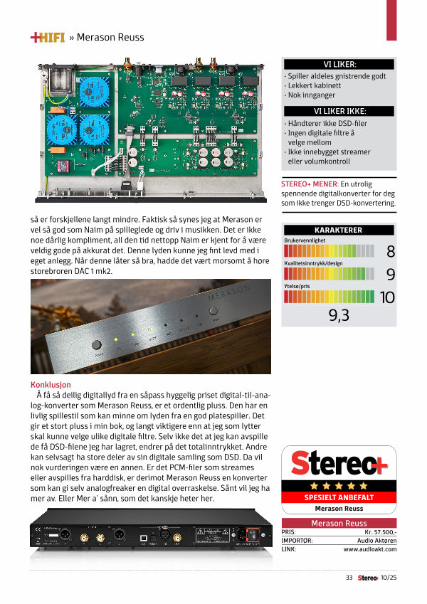 Å få så deilig digitallyd fra en såpass hyggelig priset digital-til-analog-konverter som Merason Reuss, er et ordentlig pluss. Den har en livlig spillestil som kan minne om lyden fra en god platespiller. Det gir et stort pluss i min bok, og langt viktigere enn at jeg som lytter skal kunne velge ulike digitale filtre. Selv ikke det at jeg kan avspille de få DSD-filene jeg har lagret, endrer på det totalinntrykket. Andre kan selvsagt ha store deler av sin digitale samling som DSD. Da vil nok vurderingen være en annen. Er det PCM-filer som streames eller avspilles fra harddisk, er derimot Merason Reuss en konverter som kan gi selv analogfreaker en digital overraskelse. Sånt vil jeg ha mer av. Eller Mer a’ sånn, som det kanskje heter her.