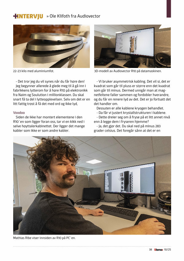 Jeg begynner allerede å glede meg til å gå inn i fabrikkens lytterom for å høre R10 på elektronikk fra Naim og Soulution i millionklassen. Du skal snart få ta del i lytteopplevelsen. Selv om det er en litt fattig trøst å få det med ord og ikke lyd,
