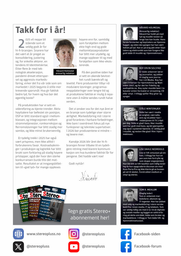 Det vi ønsker oss for det nye året er en bransje som tydelige viser større ærlighet. Markedsføring må i større grad forankres i hørbare forbedringer, ikke bare i overdrevet fokus på nye funksjoner og tekniske superlativer. I 2026 bør produsentene si mindre – og levere mer.