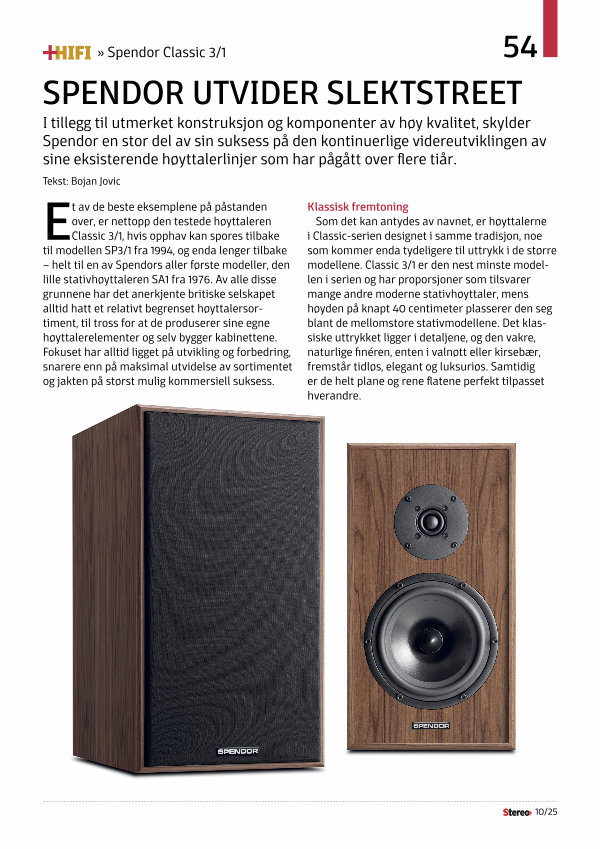 Et av de beste eksemplene på påstanden over, er nettopp den testede høyttaleren Classic 3 / 1, hvis opphav kan spores tilbake til modellen SP3 / 1 fra 1994, og enda lenger tilbake – helt til en av Spendors aller første modeller, den lille stativhøyttaleren SA1 fra 1976. Av alle disse grunnene har det anerkjente britiske selskapet alltid hatt et relativt begrenset høyttalersortiment, til tross for at de produserer sine egne høyttalerelementer og selv bygger kabinettene. Fokuset har alltid ligget på utvikling og forbedring, snarere enn på maksimal utvidelse av sortimentet og jakten på størst mulig kommersiell suksess.