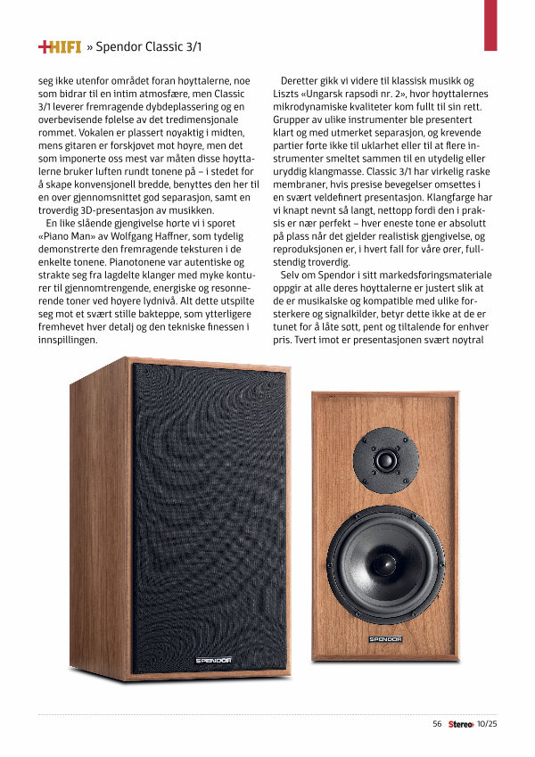 Deretter gikk vi videre til klassisk musikk og Liszts « Ungarsk rapsodi nr. 2 », hvor høyttalernes mikrodynamiske kvaliteter kom fullt til sin rett. Grupper av ulike instrumenter ble presentert klart og med utmerket separasjon, og krevende partier førte ikke til uklarhet eller til at flere instrumenter smeltet sammen til en utydelig eller uryddig klangmasse. Classic 3 / 1 har virkelig raske membraner, hvis presise bevegelser omsettes i en svært veldefinert presentasjon. Klangfarge har vi knapt nevnt så langt, nettopp fordi den i praksis er nær perfekt – hver eneste tone er absolutt på plass når det gjelder realistisk gjengivelse, og reproduksjonen er, i hvert fall for våre ører, fullstendig troverdig.