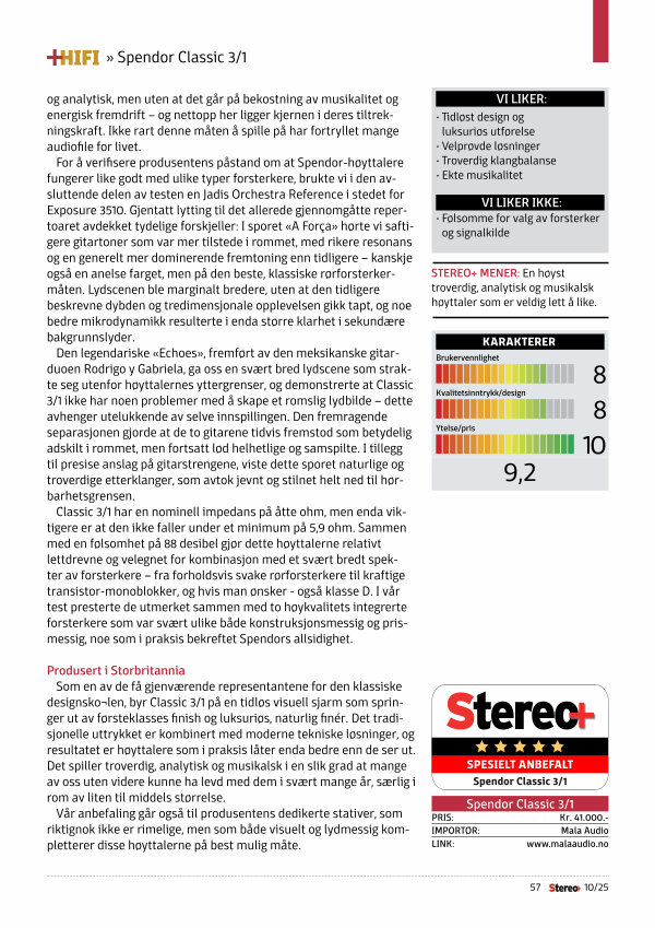 Som en av de få gjenværende representantene for den klassiske designsko ¬ len, byr Classic 3 / 1 på en tidløs visuell sjarm som springer ut av førsteklasses finish og luksuriøs, naturlig finér. Det tradisjonelle uttrykket er kombinert med moderne tekniske løsninger, og resultatet er høyttalere som i praksis låter enda bedre enn de ser ut. Det spiller troverdig, analytisk og musikalsk i en slik grad at mange av oss uten videre kunne ha levd med dem i svært mange år, særlig i rom av liten til middels størrelse.