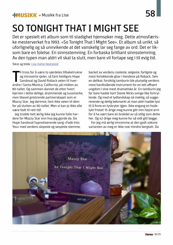Jeg trodde helt ærlig ikke jeg kunne falle hardere for Mazzy Star enn hva jeg gjorde da. Da Hope Sandoval hypnotiserende sang « Fade Into You » med verdens sløyeste og sexyeste stemme, backet av verdens cooleste, seigeste, farligste og mest forlokkende gitar i hendene på Roback. Selv en delikat, forsiktig tamburin ble plutselig verdens mest hardtslående instrument for en lett affisert ungdom i sine mest dramatiske år. En tamburin jeg før bare hadde hørt Stevie Nicks svinge like fortryllende. Og med et lydlandskap så mektig, så suggererende og deilig bekmørkt at man aldri hadde lyst til å finne en lysbryter igjen. Ikke engang en hodelykt fristet! 15-årige meg kunne gitt min høyre arm for å ha vært bare en brøkdel av så stilig som dette her. Og 42-årige meg kunne for så vidt gitt begge.