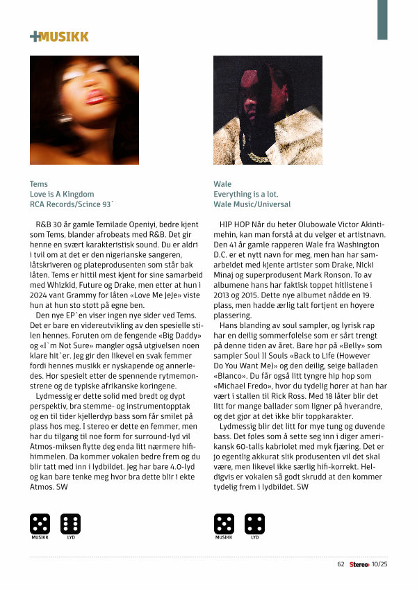 Lydmessig er dette solid med bredt og dypt perspektiv, bra stemme- og instrumentopptak og en til tider kjellerdyp bass som får smilet på plass hos meg. I stereo er dette en femmer, men har du tilgang til noe form for surround-lyd vil Atmos-miksen flytte deg enda litt nærmere hifihimmelen. Da kommer vokalen bedre frem og du blir tatt med inn i lydbildet. Jeg har bare 4.0-lyd og kan bare tenke meg hvor bra dette blir i ekte Atmos. SW
