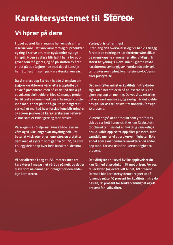 Da vi startet opp Stereo + hadde vi en plan om å gjøre karakterene våre lette å oppfatte og enkle å presentere, men nå er det på tide å gå et voksent skritt videre. Med så mange produkter til test sammen med den erfaringen vi sitter inne med, er det på tide å gå litt grundigere til verks. I et marked hvor forskjellene blir mindre og scorer jevnere på karakterskalaen behøver vi noe som er tydeligere og mer presist.