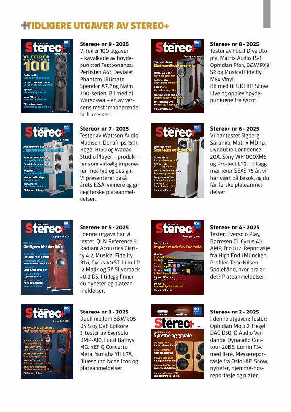 Stereo + nr 4- 2025 Tester: Eversolo Play, Børresen C1, Cyrus 40 AMP, Fiio K17. Reportasje fra High End i München. Profilen Terje Nilsen. Spolebånd, hvor bra er det? Plateanmeldelser.