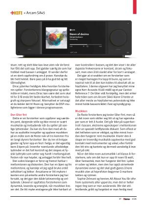 Det gjør at vi snakker om en forsterker som er meget homogen fra topp til bunn, og som er nøytral nok til at den kan kobles til absolutt alt av høyttalere. I denne utgaven har jeg benyttet mine egne Kerr Acoustic K320 mkIII og et par Canton Reference 7. De låter vidt forskjellig, men det virker hele tiden som om Arcam SA45 klarer å hente ut det aller meste av høyttalernes potensiale og ikke minst holde bassområdet i fast og kyndig grep.