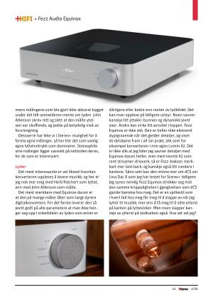 Det mest merkbare med Equinox-dacen er at den på mange måter låter som langt dyrere digitalkonvertere. For det første leverer den så jevnt godt på alle parametere at man ikke henger seg opp i enkeltdeler av lyden som enten er dårligere eller bedre enn resten av lydbildet. Det kan man oppleve på billigere utstyr. Noen savner kanskje litt attakk i bunnen og dynamikk jevnt over. Andre kan virke litt avrullet i toppen. Fezz Equinox er ikke slik. Den er heller ikke ekstremt dyptgravende når det gjelder detaljer, og viser de detaljene fram i all sin prakt, slik som for eksempel konverteren i min egen Lumin X2. Det er ikke slik at jeg føler jeg savner detaljer med Equinox-dacen heller, men med nevnte X2 som rent streamer-drivverk, så er Fezz-boksen merkbart mer laid-back, og kanskje også litt rundere i kantene. Sånn sett kan den minne mer om dCS sin Lina Dac X som jeg har testet for Stereo + tidligere. Jeg synes nemlig Fezz Equinox strekker seg mot den samme kroppsligheten i gjengivelsen som dCS gjorde hjemme hos meg. Det er en spillestil som i hvert fall hos meg får meg til å slappe av når jeg lytter til musikk, mer enn å få meg til å sitte ytterst på kanten på lyttestolen. Men noen slapper kanskje av ytterst på stolkanten også. Hva vet vel jeg?