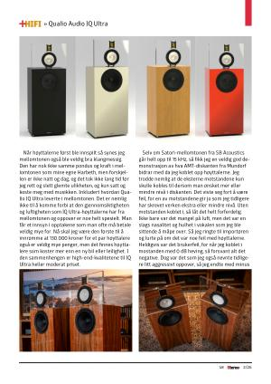 Når høyttalerne først ble innspilt så synes jeg mellomtonen også ble veldig bra klangmessig. Den har nok ikke samme pondus og kraft i mellomtonen som mine egne Harbeth, men forskjellen er ikke natt og dag, og det tok ikke lang tid før jeg rett og slett glemte ulikheten, og kun satt og koste meg med musikken. Inkludert hvordan Qualio IQ Ultra leverte i mellomtonen. Det er nemlig ikke til å komme forbi at den gjennomsiktigheten og luftigheten som IQ Ultra-høyttalerne har fra mellomtonen og oppover er noe helt spesielt. Man får et innsyn i opptakene som man ofte må betale veldig mye for. Nå skal jeg være den første til å innrømme at 130.000 kroner for et par høyttalere også er veldig mye penger, men det finnes høyttalere som koster mer enn en ny bil eller leilighet. I den sammenhengen er high-end-kvalitetene til IQ Ultra heller moderat priset.