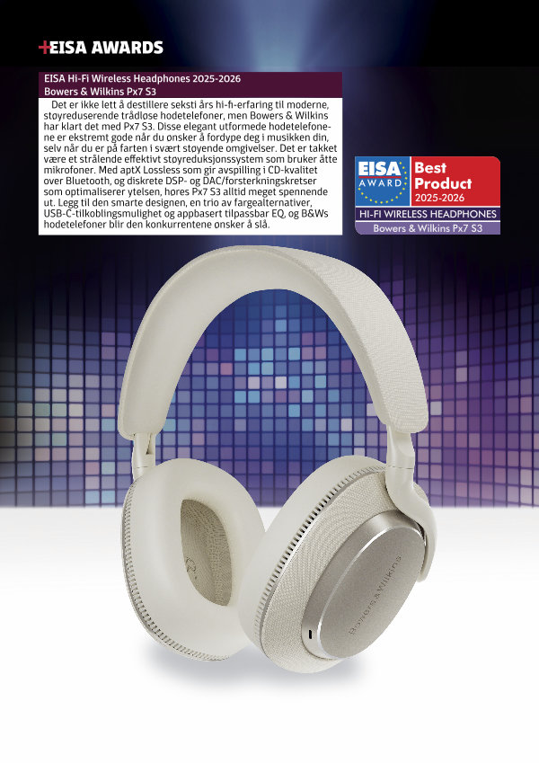 Det er ikke lett å destillere seksti års hi-fi-erfaring til moderne, støyreduserende trådløse hodetelefoner, men Bowers & Wilkins har klart det med Px7 S3. Disse elegant utformede hodetelefonene er ekstremt gode når du ønsker å fordype deg i musikken din, selv når du er på farten i svært støyende omgivelser. Det er takket være et strålende effektivt støyreduksjonssystem som bruker åtte mikrofoner. Med aptX Lossless som gir avspilling i CD-kvalitet over Bluetooth, og diskrete DSP- og DAC / forsterkningskretser som optimaliserer ytelsen, høres Px7 S3 alltid meget spennende ut. Legg til den smarte designen, en trio av fargealternativer, USB-C-tilkoblingsmulighet og appbasert tilpassbar EQ, og B & Ws hodetelefoner blir den konkurrentene ønsker å slå.