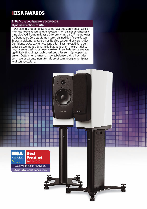 Det siste tilskuddet til Dynaudios flaggskip Confidence-serie er merkets førsteklasses aktive høyttaler – og de gjør et fantastisk inntrykk. Ved å utnytte klasse D-forsterkning og DSP-teknologier fra Dynaudios Core studiomonitorer, og med den førsteklasses Esotar 3-diskanthøyttaleren og NeoTec bass / mid-driveren, tilbyr Confidence 20As vakker lyd, kontrollert bass, krystallklare detaljer og spennende dynamikk. Stativene er en integrert del av høyttalerens design, og huser elektronikken, balanserte analoge og digitale tilkoblinger og brukerkontroller som gjør oppsettet enkelt. Dette er en avansert, nydelig balansert aktiv høyttaler som leverer varene, men uten alt bryet som noen ganger følger kvalitetshøyttalere.