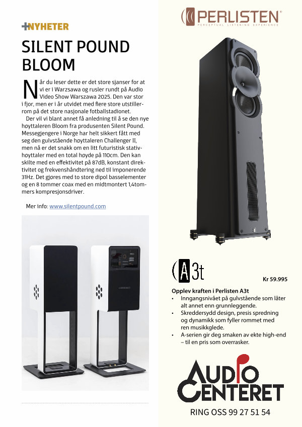 Der vil vi blant annet få anledning til å se den nye høyttaleren Bloom fra produsenten Silent Pound. Messegjengere i Norge har helt sikkert fått med seg den gulvstående høyttaleren Challenger II, men nå er det snakk om en litt futuristisk stativhøyttaler med en total høyde på 110cm. Den kan skilte med en effektivitet på 87dB, konstant direktivitet og frekvenshåndtering ned til imponerende 31Hz. Det gjøres med to store dipol basselementer og en 8 tommer coax med en midtmontert 1,4tommers kompresjonsdriver.